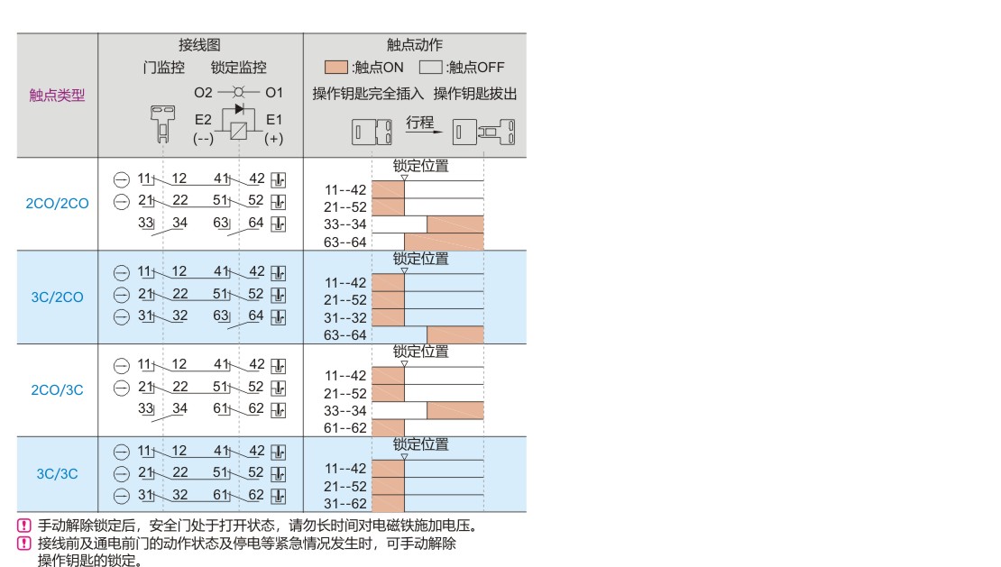 电磁锁定/机械解锁:操作钥匙插入后,此时操作钥匙仍可正常拔出,只有当对“内部电磁铁”供电后,操作钥匙才被锁定,不能拔出,且安全控制回路的触点闭