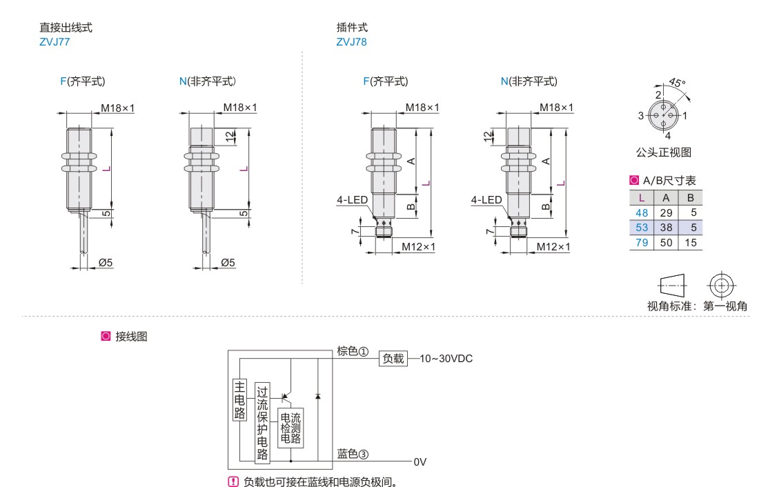 | ZVJ77 | F (齐平式) | 5 8 | M18(M18 ×1) | 35 55 | O (常开) C (常闭) |