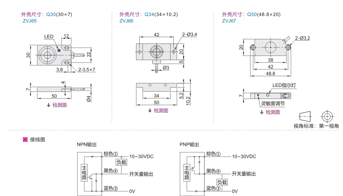 | ZVJ65 | F(齐平式) | 6(2~6) | Q30(30×7) | U(上面检测) | N(NPN) P(PNP) |