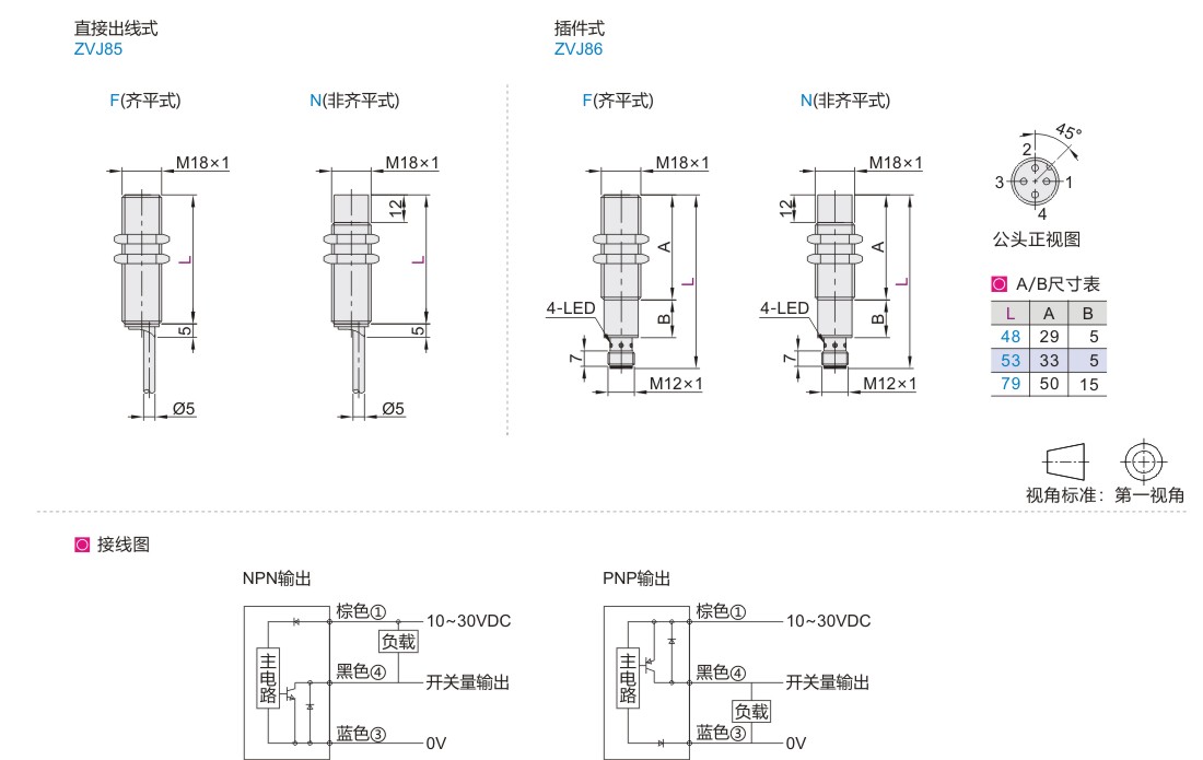 | ZVJ85 | F (齐平式) | 5 8 | M18(M18×1) | 35 55 | N ( NPN) P ( PNP) |