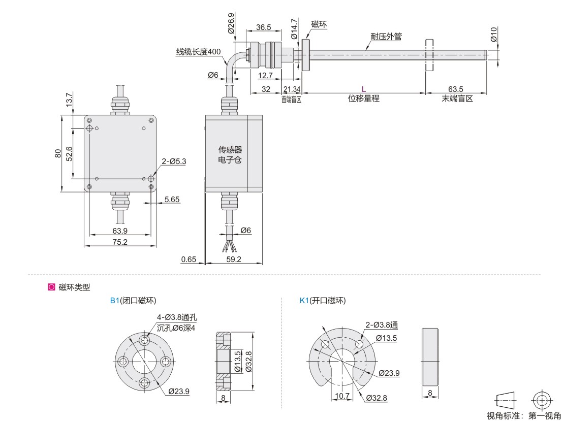 传感器内置安装时,选用闭口磁环;传感器外置安装时,选用开口磁环。