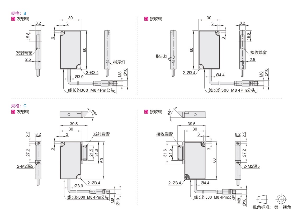 | 指示灯 | 发射端(激光发射指示灯绿色);接收端(光轴调整灯绿色,判定输出灯红色) | |
