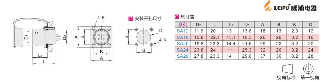 威浦 防水型 圆形连接器 SA系列 方形法兰插座