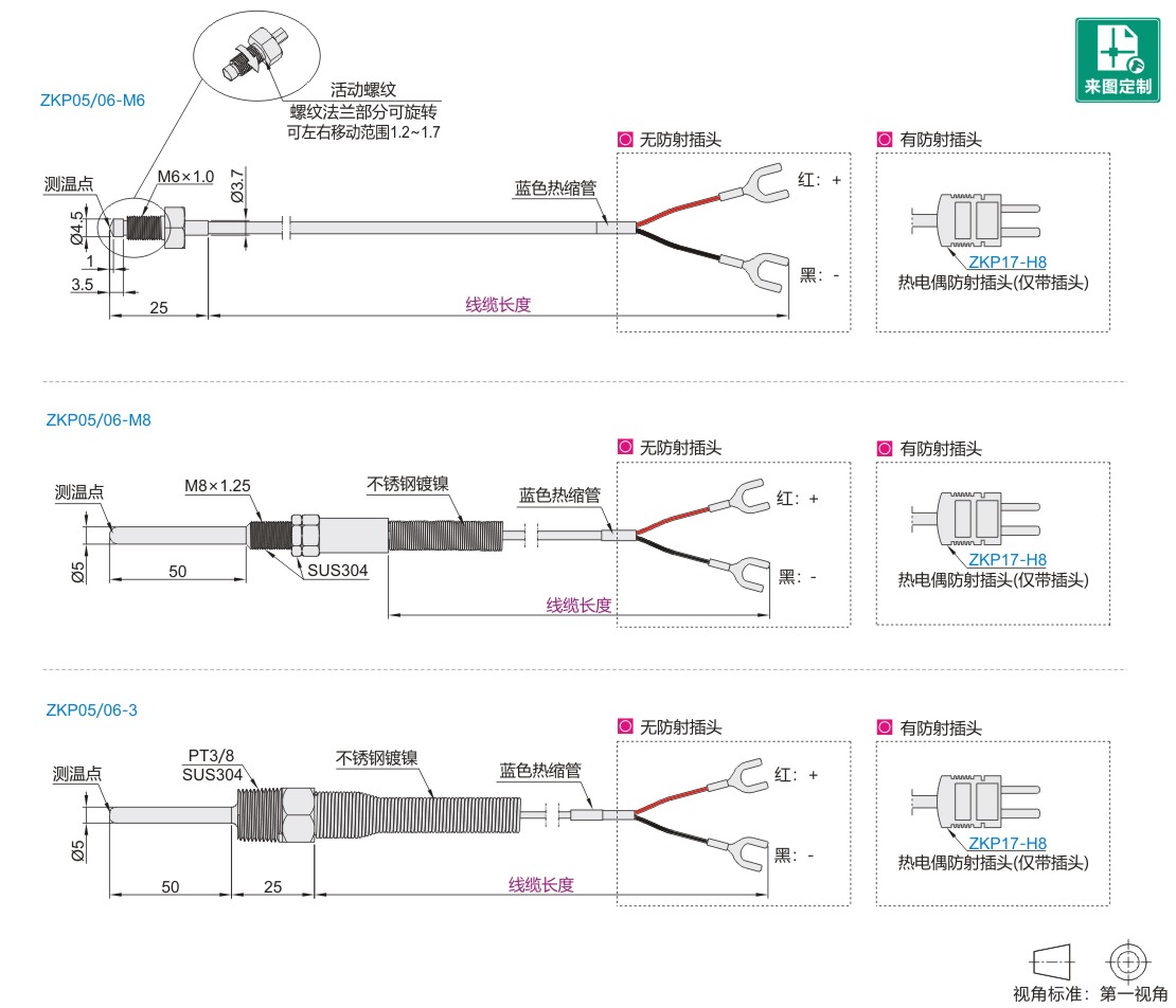 | ZKP05 | K型热电偶 | 螺丝安装型 | 标准型 | 金属网线 | 镍铬+镍硅 |