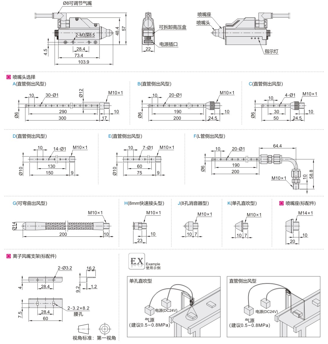 ● 配合不同的导管可短距离贴近物体,适合于点状或孔隙的地方消除静电;