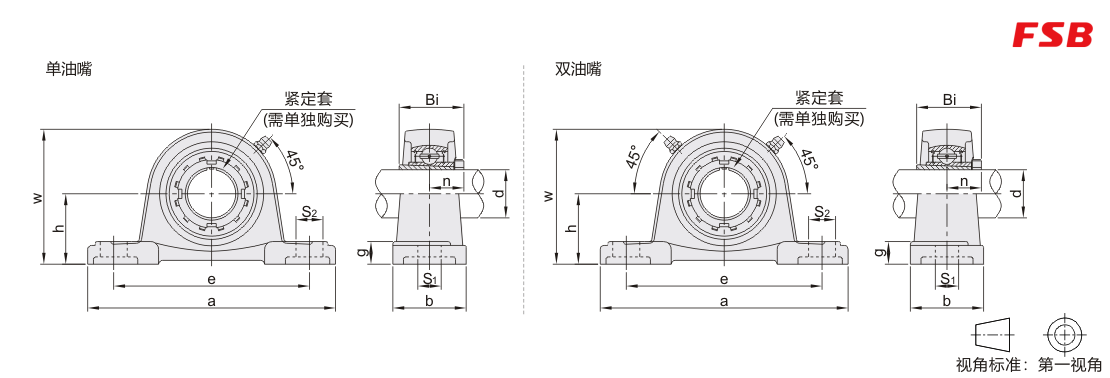 | UKP...-FSB | 立式座外球面球轴承 | 紧定套锁紧 | HT200灰铸铁 | GCr15 |