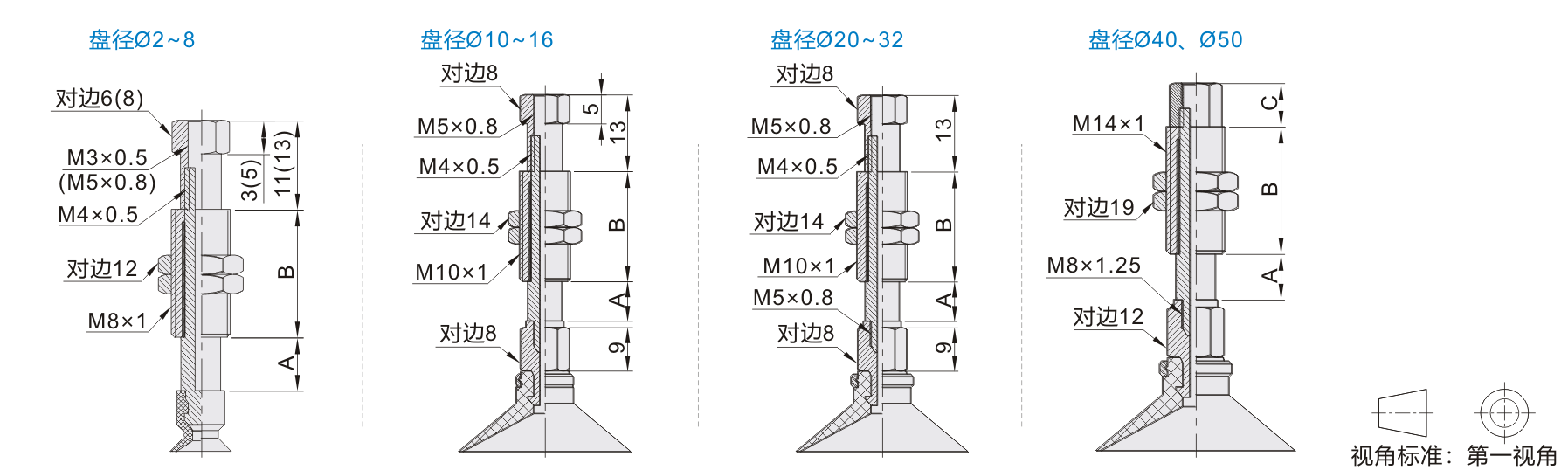 风琴形吸盘无盘径d2~d4规格。