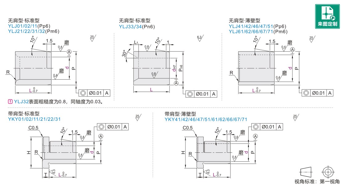 衬套 夹具用 无肩型 带肩型 L尺寸选择型 标准型 薄壁型 圆型 公差等级Pp6/Pm6 无电解镀镍
