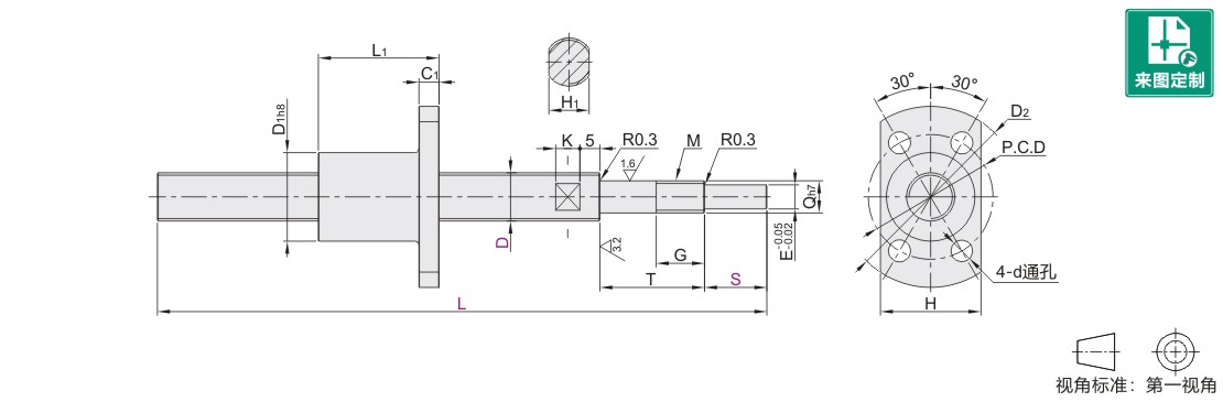30度梯形丝杠组件 法兰型螺帽 固定侧+自由侧 标准型 发黑处理